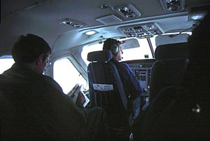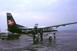 目の前にはちょっと大きめのセスナ機が止まっている。このセスナ機を見たとたん、今から行くところへの期待が一気に膨らんできた。 しゃがみながら機内に入ると、乗客4名とパイロットが一人、そして僕の計6名が全乗組員だ。キャンバス地の折りたたみシートに三点式ベルト、気分は完全に冒険飛行だ。パイロットが振り向き、非常口、といってもパイロットが乗り込む小さなドアと、乗客が乗り込んだ入口の説明とシートベルトの説明をし終えるとエンジンに点火。プロペラが回り、いよいよ念願の“フォートグッドホープ”への飛行だ。 雲が多く、下の景色はあまり見えないのだが、雲の切れ間に見える景色は、ジェット機の時と違って地面がぐっと迫っている。 僕の前に座っている女性は、ノーマンウェルズの空港で見かけた女性で、大きな荷物を持っていたので長期の滞在なんだろう。凛としてとても美しいのだが、近寄りがたい雰囲気が漂っている。たぶん、カナダ政府関係の人だと思う。この雰囲気は、ネパールの国立公園チトワンでのネパール人を従えたイギリス人の時と同じような雰囲気だ。僻地の人に対し、何かを教えてやるんだ、という威厳のようなものがプンプン感じられ、北極圏における少数民族と西洋先進国との対比、対立の一端が見えたような気がした。 パイロット席の後ろは、やはり大柄な白人男性。その後ろは、インディアンの人。 その後ろは、首も体も回らないので見えないが、みんな窓の外には感心がないらしく、本を読んでいる。それに引き替え、僕は、窓の外の景色とパイロットの仕事ぶりに釘付けになっていた。厚い雲を突き抜け降下を続けると目の前に小さな小さなグラベル(砂利道)の滑走路が見えた。滑走路と言うより砂利を敷き詰めた空き地って感じだ。想像していた以上にすごいところに来たんだと、体中が興奮している。 |