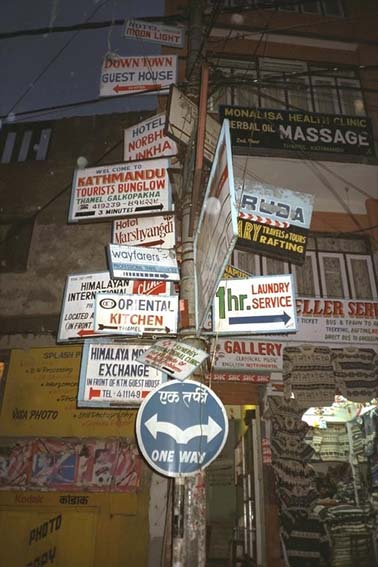 | カトマンズの街に入ると、英語の看板がいっぱい。 これなら一人で歩けそうだ。 |