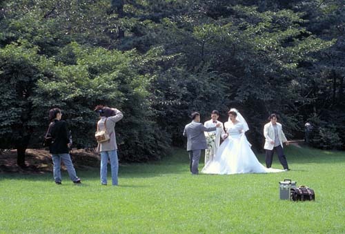 | 週末や日曜日、韓国の街を歩いているといろんな所に 純白のウエディングドレスとモーニング姿の新婚カップルが目につく。 由緒ある建物や公園では、まるで映画のロケーションのように 新婚カップルを取り囲み写真やビデオの撮影がおこなわれている。 1組のカップルに専属のカメラマンやスタッフが雑誌の写真撮影のように ポーズに注文を付けている。 美しいウエディングドレスの花嫁さんと派手なパフォーマンスに なんだろうと思っていたら、韓国では、普通の新婚カップルの姿だそうだ。 結婚式を終えると友人やプロカメラマンをひき連れ、 美しい景色の前で婚礼写真を撮るそうで、結婚式費用の1/3以上が この撮影にかけ、結婚式を撮影するカメラマンは非常にリッチらしく、 あこがれの職業だそうだ。 在日韓国人の友人の結婚式によく出席していたので、 本場では、チョゴリの花嫁姿を見られるものと思っていたのが 見事に裏切られてしまった。 2週間の韓国滞在中に水原の民族村で見たチョゴリ姿以外、 街でチョゴリを見かけたのは3人ほどしか無かった。 ソウルの人よりも大阪に住んでいる僕の方が 女学生の民族服の制服や色彩豊かなチョゴリを見ているような気がする。 祖国を離れる方が、より自国の伝統を守り伝えているようで、 在日韓国の人も、ブラジルやハワイに住む日系のお年寄りが 現在の日本人より日本的なものを大切にするのと同じようなものだろう。 |