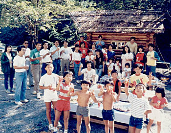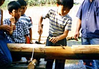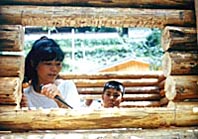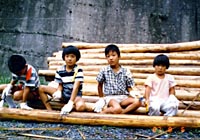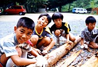 幼稚園に行く前の子供から小学校6年生までの子供達とお母さん、お父さん達のチャレンジの記録です。広場に積み上げられた100本の丸太、皮むきから始まり、整地、基礎作り、丸太に一つずつノッチ(切り込み)を入れて積み上げると,それらしい雰囲気に。