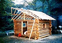 設計図も無く始めたログハウス作り、ログが屋根の高さまで積み上がってくると、急きょ設計会議。ああでもない、こうでもないとみんなの意見がまとまったのがこの形に。
