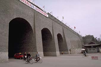 | 碁盤の目に区画された西安の街を,どの方向に歩いても巨大 な城壁に突き当たる。この巨大な城壁の前に立つと、 いかに大きな建造物かがわかる。 |