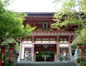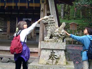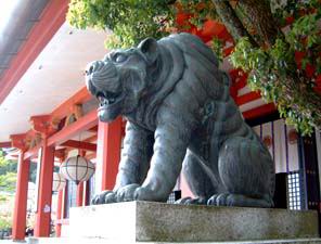 | 鞍馬寺の本堂(金堂)に到着。桃源郷のような・・・。 | なんと鞍馬寺の本殿を守ってるのは阪神、 いやトラでした! |