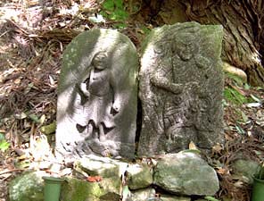 | この石仏、素朴な彫り物でステキね | 変な物見つけたら、手を合わせたくなるのよね |