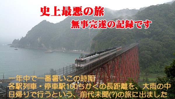 | 史上最悪の旅からの帰還 一年で一番暑いこの時期に、往復で94もの駅に停車するという 各駅停車(復路の一部、快速)の旅に行って来ました。 停まる駅も最近の旅では考えられない数の過酷な旅でした。 また、当日は激しい雨も降り、 停車駅だけでも過酷だと思っていた旅に 豪雨という追い打ちもありました。 旅を終えるまでは、 なんでこんな日に限ってこんな天気なの?と、 運命を恨んだりもしました。 しかし、応挙の寺(大乗寺)では 本物のふすま絵の素晴らしさに触れられました。 もう来月からは本物は宝物庫に入れられ、 レプリカの展示になるとのこと。 最終目的の余部(あまるべ)鉄橋は雨にかすみ、 天気のいいときに見るよりも 荘厳な姿を見せてくれてるように思いました。 たぶんそれは、 三年先にコンクリートの新橋に架け替えられるから、 そのように見えたのでしょうね。 旅は過酷だったのですが、帰ってきた今となれば なんと楽しく素敵な旅をしてきたのでしょう! と身震いするほどの思いです。 応挙のふすま絵といい、余部鉄橋といい、 我々の目の前からは消えてしまうのです。 それらが消えてしまう直前に、 わたしたち自身が目撃できたのです。 もう二度と撮れなくなる、たくさんの写真も残しました。 わたしたちは、歴史を目撃し記録出来たのです。 史上最悪の旅だと思ったのは、 じつは史上最高の旅だったのです。 10人がいっしょに歴史を目撃できたなんて すごく素敵なことですね。 emi michiko kayoko noriko naomi yasuko yoko keiko atsuko chie |