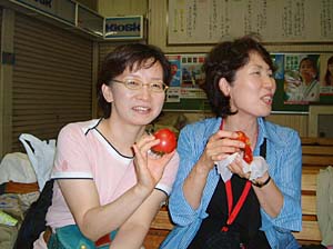 | 濡れた身体にクーラーは厳しいわね! | わたしは食べてカロリー補給するの! 華代子さんも食べたら! いいわよ |