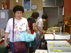 | あなた、料理のプロなんでしょ、どうこの魚? | 新鮮なんだけど、生もの持って帰れないものね。 | ||