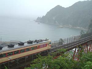 | 遂に余部鉄橋にさしかかりました! | まさに地上41メートルを、それも、明治時代に作られた きゃしゃな鉄橋を走っているんです。カンゲキ! |