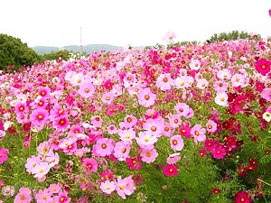 昨日とは、打って変わっての秋晴れの下、コスモスは、満面の笑顔で私達を出迎えてくれました。花道も主婦の私達を一時スターにしてくれ気分爽快!又下から見る眺めはまるで壮大なピンクの絨毯のよう・黄色のコスモスは、空色と合わせるとはかなくて、でもなんだかほっこりと暖かく、そばでお茶とお菓子を頬張りながら幸せな朝の一時でした。朝一番の万博は、家事を一休みしてでも御覧になられること価値ありです。