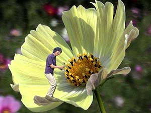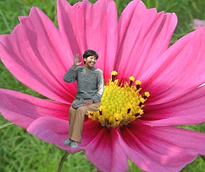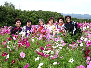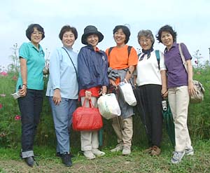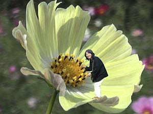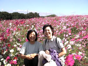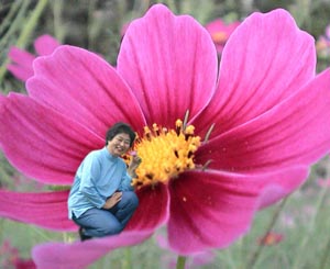 2001・10/16 一子私も妖精よ! 私もね! 今日から、私“華の精”よ! 私も“華の精”よね! こんな大きなコスモス見つけたよ! 写真はね、こう撮るのよ、安子さん! 歩いて嬉しい、座って美味しいひととき!