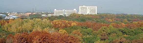 | 眼下に、ステキな緑地が広がっています。 尚子と阪大へ行った時14階のレストラン(入らなくても見えました)から万博を見るとなんと素晴らしい紅葉が広がっているのでしょう。万博を両手で抱えたみたい!と思いました。 11/18 朋子 ※朋子さ〜ん見える?こちら、ソラードの上ですよ! 安子 |