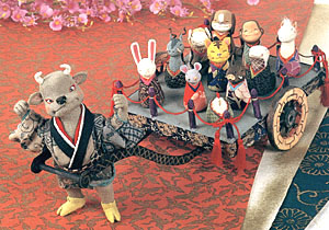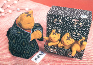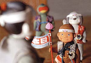 2004年 申年 「桃太郎さま われわれも人道援助に参りましょう!」 雨にもマケズ 風にもマケズ・・・ 東に病気の子供あれば 行って看病してやり、 西に疲れた母あれば 行ってその稲の束を負い 南に死にそうな人あれば 行って「怖がらなくてもいい」といい 北にけんかや訴訟があれば 「つまらないから止めろ」といい ・・・そういう者に 私はなりたい(宮沢賢治より) |