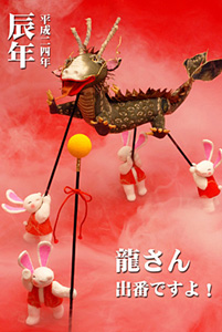 2012年 辰年 伝説の生き物 “龍” 君の逞しさに期待しているからね! 2011年の卯年は、がんばることばっかりだったけれど、君がおもいっきり、みんなを陽の差す世界に導いてくれるよね。 |
