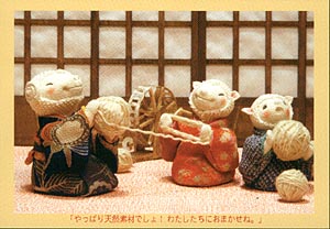 2003年 未年 「やっぱり天然素材でしょ!! ・・・わたしたちにおまかせね。」 最近は化学繊維も優しいものが多くなったけれど、やっぱり天然素材が優しいんじゃないですか。 私たちなら、どんどん造りますよ・・・ |