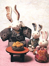 1999年 卯年 「何が聞こえるの?」「とってもいいことよ!」 とってもいいことがありそうな、そんな予感が・・・ 永かった不況に、ほんの少し人々の足音も活発になってきたような、そんなにぎやかな足音が聞きたくて・・・。 |
