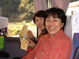 | 鹿にも会えたし、ミカンも食べたし、満足満足・・・ | 牛石前で記念写真パチリ!“牛石”が見えないよ〜 | ||